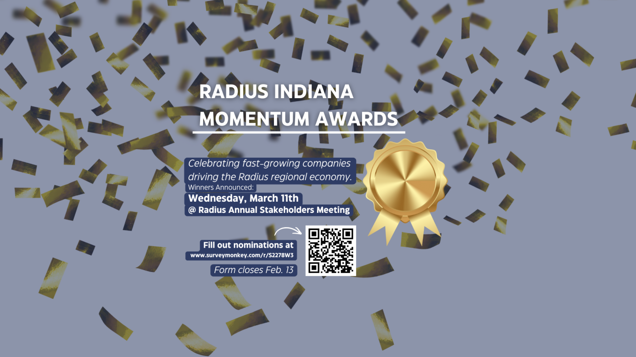 Celebrate the companies fueling growth across the Radius region! The Radius Indiana Momentum Awards recognize the fastest-growing businesses driving economic momentum through job creation, revenue growth, and market expansion. Business leaders and community partners will come together at the Radius Stakeholders Luncheon on March 11 to honor the innovators shaping our region’s future.